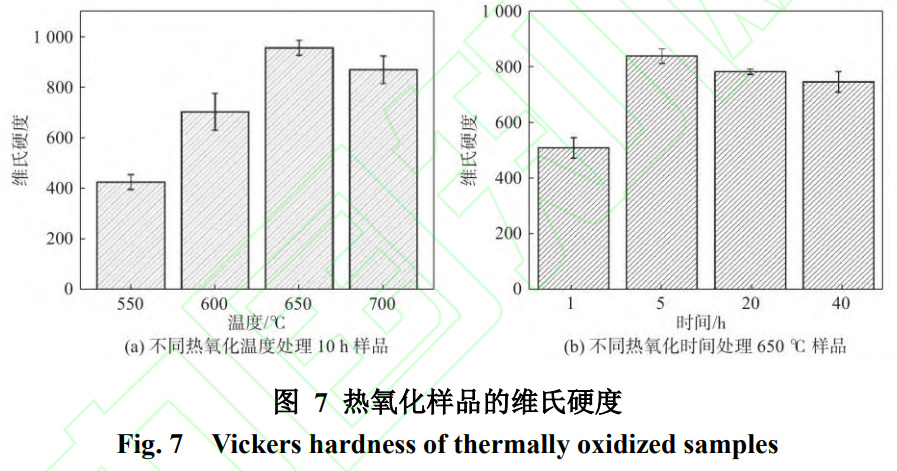 不同熱氧化條件下的顯微硬度如圖7所示。如圖7(a)是不同熱氧化溫度條件下的硬度,可以發現熱氧化溫度升高促進了顯微硬度的升高。與550℃時氧化的樣品相比,650℃時氧化樣品的硬度增加了一倍多,維氏硬度達到了937.8。由圖3的XRD譜圖可以看到,由于樣品表面的金紅石型二氧化鈦隨著溫度的升高在增加,而金紅石型二氧化鈦的晶體結構為六方最密堆積結構,并且熱穩定型性較好,所以樣品表面的硬度在增加。當700℃時氧化樣品的硬度下降,是由于當溫度達到700℃時,樣品表面氧化層中的氧化顆粒過于長大,氧化顆粒之間的擠壓和膨脹導致表面氧化層開始有些許剝落,所以硬度的誤差較大,且硬度較小。如圖7(b)是不同熱氧化時間條件下的硬度,可以發現在10h內熱氧化時間的增加也會促進顯微硬度的升高,但是當時間進一步增加,雖然樣品的氧化層增厚,但是硬度卻開始有所降低,如圖7(a)和(b)可以發現在650℃/10h時氧化樣品的硬度達到最高值為937.8,當時間增加到20h時,氧化樣品的硬度下降到785.2。而當時間繼續增加,氧化樣品的硬度也在繼續下降。這是由于樣品氧化層中的氧化顆粒在隨著時間長大,在10h內是正常長大,當時間增加到20h,樣品中的氧化顆粒繼續長大,并且氧化顆粒的生長方向不一致,導致氧化樣品的氧化層與基體之間的結合力下降,硬度也隨之下降。