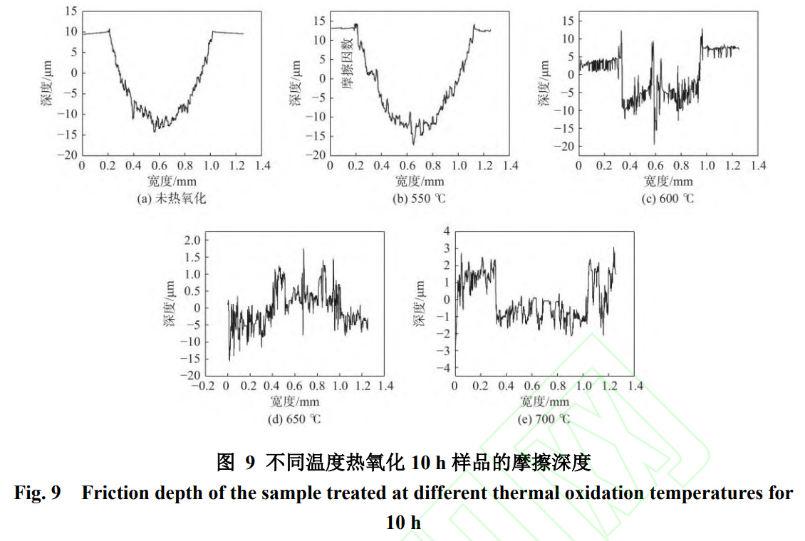 圖9和圖10分別為未經熱氧化的Ti6Al4V鈦合金和經過不同溫度熱氧化10h的Ti6Al4V鈦合金的摩擦深度磨損形貌。從圖9(a)和9(b)中可以發現,550℃/10h處理后的樣品深度與未經處理的樣品深度相比沒有明顯的升高,大致都在15μm左右。這是因為在550℃時形成的氧化膜較薄,樣品表面的氧化顆粒沒有完全長大,當在摩擦過程中遇到硬度更高的摩擦副時,氧化膜很容易脫落。而當熱氧化溫度進一步增加,試樣的摩擦深度變淺。這是因為熱氧化樣品的氧化層厚度增厚,試樣表面的氧化顆粒長大,樣品的硬度增加,從而摩擦更加困難。在不同處理溫度下,650℃時的樣品深度最小,僅為1.5μm左右,平均深度在0.35μm左右。表面磨損形貌顯示,650℃時樣品表面最為致密。結果表明,經過熱氧化后的樣品深度更淺,且氧化層硬度越高,表明耐磨性越好。從圖10中可以看出,干滑動過程中的磨損機制可歸結為黏著磨損和磨粒磨損的混合機制。未經熱氧化的樣品的磨損軌跡表現為寬而深的溝槽,表明嚴重的磨粒磨損和黏著磨損。而熱氧化后的樣品表面只有少量的磨損痕跡,磨損軌跡表明熱氧化后的樣品的耐磨性有明顯改善。對比不同溫度熱氧化的樣品可以看出,Ti6Al4V鈦合金在600℃和650℃時的磨損痕跡比550℃時的磨損痕跡要輕。550℃時樣品的磨損痕跡為寬大的溝槽,600和650℃時樣品表現為較淺的摩擦痕跡。磨損機制表現為輕微的磨粒磨損。然而,在700℃時,表面氧化層在摩擦過程中很容易脫落,如圖10(e)所示。綜合考慮樣品的表面形貌和硬度,可以得出結論:樣品的氧化膜越致密,氧化層的硬度越高,因此越難以被摩擦下來。在氧化膜表面形成的劃痕軌跡也會相應地更淺。熱氧化樣品摩擦磨損的減小可以解釋為:當兩個表面相互接觸時,應力使表面發生彈性和塑性變形。熱氧化限制了層間的塑性和彈性變形,大大降低了摩擦和磨損。其次,金紅石相TiO2導致抗剪強度低,從而降低了摩擦[20]。