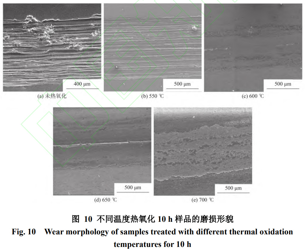 (3)未經處理的樣品的磨損機制主要為嚴重的磨粒磨損和黏著磨損。經過熱氧化后,鈦合金表面的磨損深度和磨損率顯著改善,并且與氧化層的硬度結果變化規律一致。有效提高了鈦合金表面的耐磨性。綜合考慮,最佳的熱氧化溫度和時間為650℃和10h。