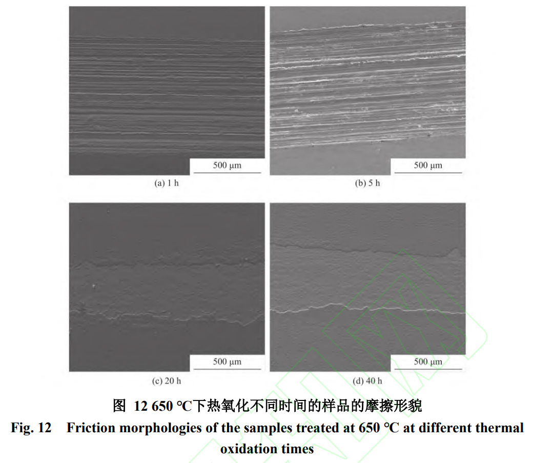 650℃熱氧化不同時間的樣品的摩擦深度如圖11所示。從圖11中可以發現,熱氧化1h和5h時樣品的摩擦深度都在15μm左右,與未經熱氧化的樣品的深度(圖9a)相差不大。這是由于在這兩個條件下樣品的厚度較薄,氧化顆粒還未完全覆蓋樣品表面,此時的氧化層硬度較小,無法支撐住氧化層接受劇烈的摩擦。在經過循環摩擦后,氧化膜完全破裂,摩擦球直接與基體接觸進行摩擦。所以這兩種條件下樣品的摩擦深度較深。隨著熱氧化時間的增加,樣品的摩擦深度在變淺。在熱氧化10h時的樣品的摩擦深度最淺,僅為0.35µm(圖9d),熱氧化20h和40h時的平均摩擦深度為2.052~2.55µm,均大于10h時的。綜合來說,隨著熱氧化時間的延長,樣品的摩擦深度由深到淺再變深。而從圖12中也可以看出,熱氧化1h和5h時,樣品的磨痕形貌與未經熱氧化的樣品有相似的寬而大的溝槽,表現出嚴重的磨粒磨損和黏著磨損。熱氧化20h和40h時的樣品表面的氧化層在摩擦過程中脫落,露出內層的氧化層。這由于20h和40h的熱氧化樣品的氧化膜由多層組成,但是層與層之間的結合狀態很差。干滑動會導致氧化層接觸區域產生局部應力,因此,黏合不良的氧化層將被分離,并在粘附和磨粒磨損下脫落。