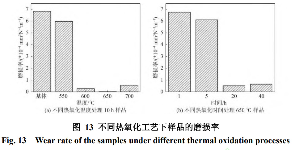 圖13(a)展示了不同溫度熱氧化條件下樣品的磨損率?梢杂^察到基體的磨損率最高,熱氧化明顯降低了Ti6Al4V鈦合金的磨損率。對比不同溫度熱氧化的樣品,發現隨著溫度的升高,樣品的磨損率呈下降趨勢。然而,在溫度高于700℃后,樣品的磨損率有所上升,這與磨痕形貌的變化和氧化層的硬度變化規律相符。這是由于700℃時樣品氧化膜的結合狀態不佳導致的磨損體積增加。因此,可以得出結論,在不同熱氧化溫度處理的樣品中,650℃的耐磨性最好。而通過不同熱氧化時間條件下樣品的磨損率如圖13(b)可以發現,與未經處理的Ti6Al4V鈦合金相比,經過不同熱氧化時間處理下的磨損率明顯降低。不同熱氧化時間的樣品相比,在650℃/(1~10)h熱氧化樣品的磨損率呈下降趨勢,在10h時達到最低。當時間增加到20h后,氧化樣品的磨損率呈增長趨勢。這是因為氧化時間增加,氧化樣品的涂層變厚,但涂層中氧化顆粒之間的空隙變大,涂層變得疏松,在摩擦過程中,被磨下來的摩擦體積增大。所以20h后氧化樣品的磨損率增加。因此在不同熱氧化時間條件下,10h的耐磨性最好。