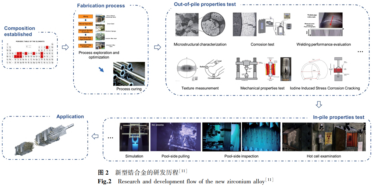 德國(guó)化學(xué)家馬丁.海因里希.克拉普羅斯于1789年首次發(fā)現(xiàn)了鋯元素。1824年,瑞典化學(xué)家喬斯.雅各布.布雷澤利烏斯通過在鐵管中混合加熱鉀和氟化鋯,在實(shí)驗(yàn)室中分離出這種金屬。直到1925年,荷蘭化學(xué)家A.E.vanArkel和J.H.deBoer才發(fā)明了一種碘化物工藝來熱分解四碘化鋯,并生產(chǎn)出更純的金屬鋯。這種韌性金屬被稱為碘化金屬或晶體棒,具有良好的延展性,可以冷加工。當(dāng)時(shí),大多數(shù)生產(chǎn)的金屬用于電子工業(yè)的吸氣和真空管部件,但工藝昂貴,供應(yīng)有限。到1948年,只有幾噸被用于工業(yè)生產(chǎn)中。20世紀(jì)40年代末,美國(guó)率先研究了鋯在水冷反應(yīng)堆中的應(yīng)用,之后俄羅斯、法國(guó)、德國(guó)等國(guó)自20世紀(jì)50年代起先后研發(fā)出一系列鋯合金。1951年,美國(guó)科研人員通過利用Sn元素吸收鋯合金中的有害元素,研發(fā)出了Zr-2.5Sn合金,即Zr-1合金,然后調(diào)整元素組成研制出具有優(yōu)良綜合性能的Zr-2合金,并用作世界第一艘核潛艇的核燃料包殼材料,后來又加以改進(jìn)研制出Zr-4合金,一直沿用至今[4]。為了解決Sn元素含量較高導(dǎo)致鋯合金耐腐蝕能力無法進(jìn)一步提高的問題,隨著冶煉技術(shù)的提高,人們通過控制Sn元素含量并提高其中的鐵和鉻的含量對(duì)Zr-4合金進(jìn)行了改進(jìn)。此外,Zr-Nb系合金也得到了世界各國(guó)的關(guān)注,如加拿大開發(fā)了Zr-2.5Nb合金[5],前蘇聯(lián)研制了E110等系列鋯鎳合金[6]。近年來,隨著工業(yè)化的發(fā)展和技術(shù)水平的提高,各種高性能新型鋯合金也不斷被研發(fā)出來,如美國(guó)的Zirlo合金[7]、日本的抗腐蝕新合金(NDA)[8]、前蘇聯(lián)的E635合金[9]、法國(guó)的M5合金[10]等。新型鋯合金的研發(fā)歷程如圖2所示[11]。