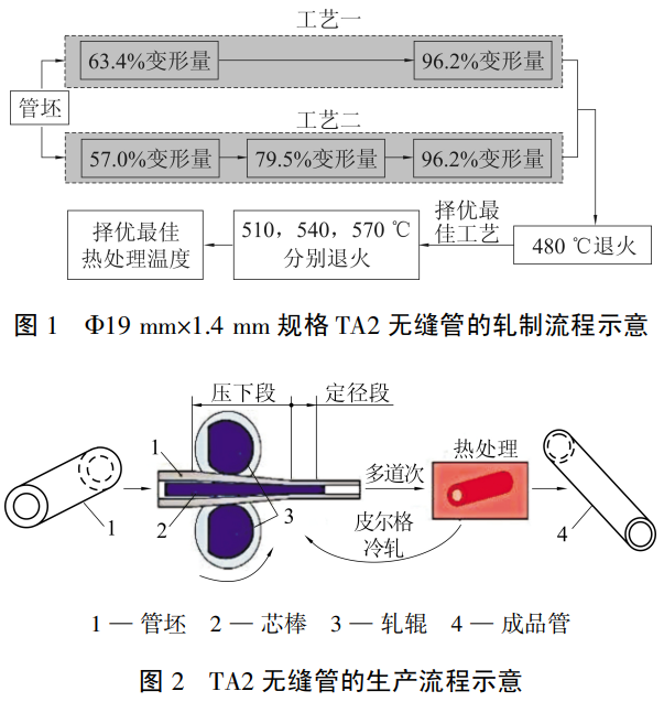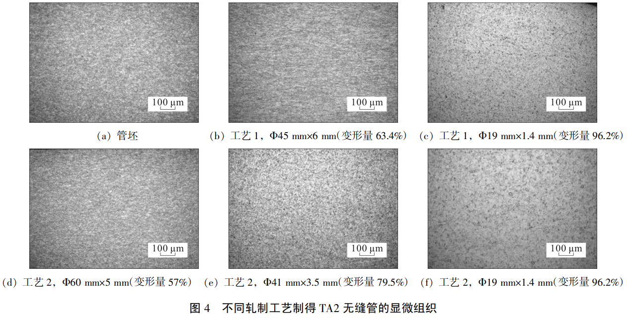 分析不同軋制工藝制得的椎 19 mm×1.4 mm 規格TA2無縫管的尺寸偏差和拉伸性能、顯微組織,以及不同熱處理溫度時TA2無縫管的力學性能和顯微組織。