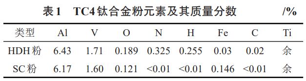 粉末原料采用氫化脫氫(HDH)TC4粉末和球形(SC)TC4粉末,粉末元素及含量見表1,兩種粉末形貌及粒徑分布見圖1。凝膠體系中有機單體為甲基丙烯酸羥乙酯(HEMA,分析純,純度大于等于98.5%),交聯劑為N,N-二甲基丙烯酰胺(MBAM分析純,純度大于等于98.5%),溶劑為二甲苯(C8H10分析純,純度大于等于99.5%),引發劑為過氧化苯甲酰((C6H5CO)2O2,簡稱BPO,分析純,純度大于等于98.0%)。油酸和異辛醇分別作為分散劑和消泡劑。