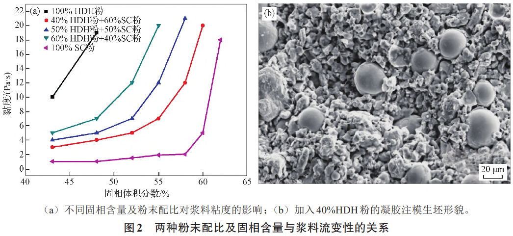 對凝膠注模料漿來說,球形粉末流動性好,不易氧化,而氫化脫氫粉保形性好,但流動性差,比表面積大,燒結時易與雜質元素反應導致性能變差,但從成本上考慮,在料漿中添加40%(質量分數)以上的氫化脫氫粉,總原料成本可降低30%以上,有利于實現低成本的目標。另一方面,在粘結劑一定的情況下,固相含量越高,燒結收縮系數越小,產品尺寸越穩定,但過高的固相含量會使漿料流動性變差而影響成形。因此,在保證粘結劑和油酸濃度不變的情況下,對不同粉末配比及固相含量的漿料粘度進行測試,結果如圖2所示。當固相含量相同時,球形粉末占比越高,料漿的流動性越好。綜合考慮成本和料漿性能,當料漿中加入50%(質量分數)HDH粉時,固相含量為55%(體積分數)時,既能保證漿料一定的流動性,同時還有較低的收縮系數。