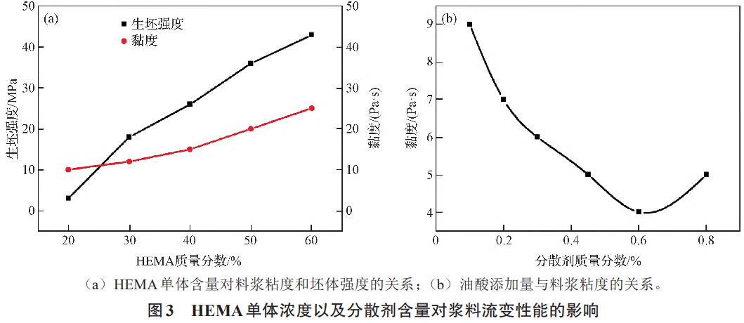 粘結劑的濃度對漿料流動性和生坯強度有重要的影響。粘結劑濃度過低,生坯強度不足,產品難以保持形狀,粘結劑濃度過高,漿料流動性差,脫脂時間長,殘留雜質多,因此,需要在保證漿料流動性和生坯強度的情況下盡量降低粘結劑的濃度。圖(3a)為加入50%HDHTC4粉,固相含量55%時漿料濃度隨HEMA單體濃度的變化曲線。由圖可知,漿料粘度的升高速率隨單體濃度的增加而逐漸降低,這是由于HEMA單體具有一定的懸浮分散作用,濃度增加時可在一定程度上提高漿料的流動性。當單體濃度為30%(質量分數)時,漿料流動性較好,同時保證生坯具有足夠的強度。