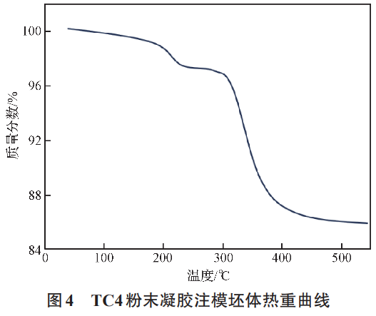 在生坯脫脂過程中,鈦合金粉末容易被氧化,須在真空或者惰性氣氛中進行。為制定適合的熱脫脂升溫制度,了解粘結劑在各個溫度下的分解情況,減少粘結劑以游離碳的形式殘留在脫脂坯,對坯體進行了熱重分析。圖4為凝膠坯體熱重曲線,第一階段為結合水的去除、調節劑和大分子鏈的裂解。此階段發生在230~350℃之間,鈦粉有約2.2%的失重。第二階段在350~450℃,此階段失重速度最快。350~400℃失重曲線最陡,對應聚合物網絡的大規模分解,400~450℃失重速率逐漸下降,在350~450℃時失重約10.3%。第三階段為450℃之后,仍有較少量的失重,這是因為在熱重測試過程中升溫速率較快,分解殘留物不能排除。根據上述熱分析結果,凝膠注模鈦在脫脂燒結過程中,應在較小的升溫速率下,在300~450℃之間緩慢加熱,避免有機物分解過快導致坯體開裂。