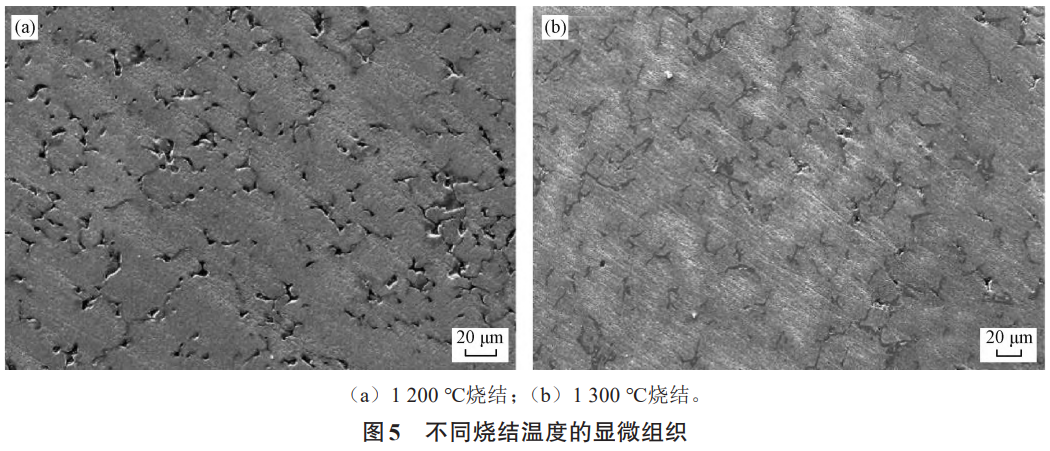 圖5為不同燒結溫度下燒結態樣品的微觀組織。當燒結溫度為1200℃時,在組織中存在較多孔隙,并且孔隙呈不規則形狀且連續,燒結密度僅有94.3%。當燒結溫度提高至1300℃時,組織中的孔隙數量明顯減少,且形狀均為細小的圓形封閉孔洞,燒結密度達到99.5%。