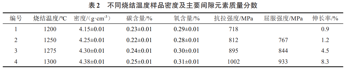 坯體在1200~1300℃下真空燒結后的力學性能和密度在表2中列出。結果顯示,在1200~1300℃溫度范圍內,樣品的致密度隨溫度的升高而升高,1300℃時基本達到全致密。在1200℃燒結時,燒結密度僅有4.15g/cm3,相對密度94.3%,導致屈服強度僅為718MPa,基本無伸長率。燒結溫度繼續升高至1275℃時,密度升高至4.30g/cm3,強度和塑性明顯提高。1300℃燒結的樣品燒結密度達到4.38g/cm3,相對密度達到99.5%以上,基本達到全致密,抗拉強度為1002MPa,屈服強度為933MPa,伸長率為8.3%。