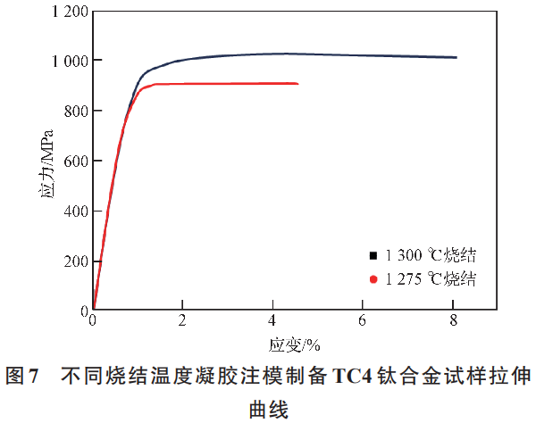 1275℃燒結時相對密度97.5%,內部仍殘留約2.5%的孔隙使材料強度、韌性下降,是伸長率偏低的主要原因。當提高燒結溫度至1300℃,抗拉強度和伸長率都大幅度上升。通常來說,TC4鈦合金的抗拉強度一般在895~965MPa之間,經過固溶處理和時效處理,抗拉強度可以提高到1100MPa或更高。在1300℃燒結后,抗拉強度為1002MPa。這由于較高溫度下燒結的相對密度較高,強度和塑性都隨致密度的升高而升高。然而,相比未經強化處理的樣品,抗拉強度仍明顯偏高,除了致密度上升帶來綜合性能的提高,還歸因于氧、碳元素的固溶強化,以及TiC顆粒的第二相強化。
