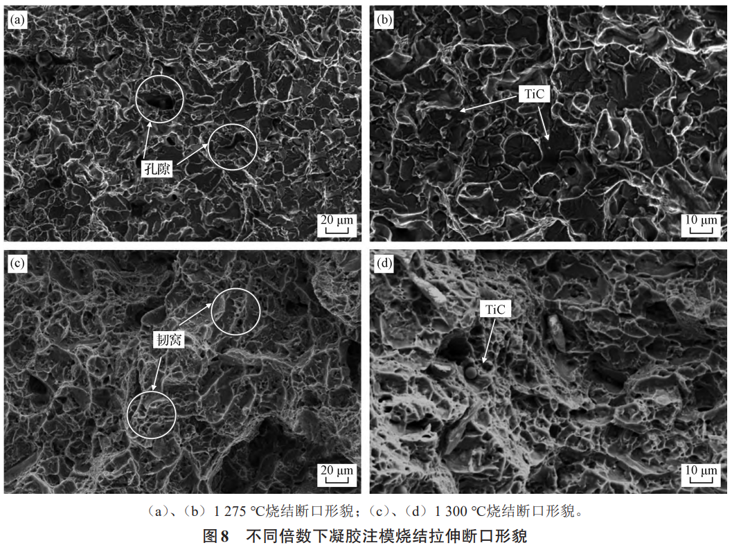 通過試樣的斷口形貌進一步佐證。拉伸試驗后燒結樣品的斷口形貌如圖8(a)、(b)所示,由圖可知,不同溫度的斷裂形態有明顯差異。當燒結溫度為1275℃時,宏觀形貌比較平整,伸長率較低,其斷口形貌以脆性斷裂為主,且斷裂面發現多處較大的孔洞和縫隙。先前的研究表明,在存在大孔隙的情況下,裂紋更容易萌生和擴展。由于此時相對密度僅為97.5%,尚有約2.5%的殘余孔隙,導致應力集中和裂紋擴展,所以樣品的強度和塑性都較低。當燒結溫度升高至1300℃時,如圖8(c)、(d)所示,斷口處可觀察到典型韌性斷裂斷口的韌窩組織,且韌窩較細密。