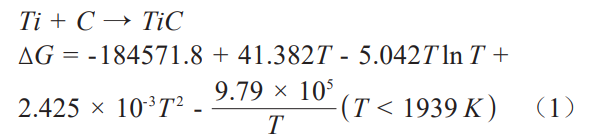 在1473~1573K下,Ti與C反應的吉布斯自由能∆G<0,表明在1200~1300℃下燒結時,TiC的原位生成是自發的。工業生產中,由于TiC硬度高,熔點高,化學穩定性好,與鈦基體具有良好的冶金相容性,常常作為鈦基合金或純鈦基質的增強相。