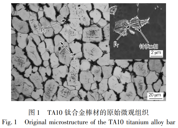 選取直徑為ϕ125mm的TA10鈦合金棒材作為試驗材料,采用電感耦合等離子體(Inductivelycoupledplasma,ICP)對試驗合金進行具體化學成分測試,測得結果(質量分數,%)為0.295Mo、0.79Ni、0.04O、0.073Fe,余量Ti。采用連續升溫金相法測得TA10鈦合金的相變點為890℃。圖1為經多次鍛造后TA10鈦合金的原始加工態微觀組織。由圖1可知,基體中除包含少量β轉變組織(βT)外,其余基體均被等軸初生α相(αp)所占據。通過高倍微觀組織發現,大量細小針狀α相存在于βT中,組織中初生α相含量超過50%,故該組織類型為等軸組織。