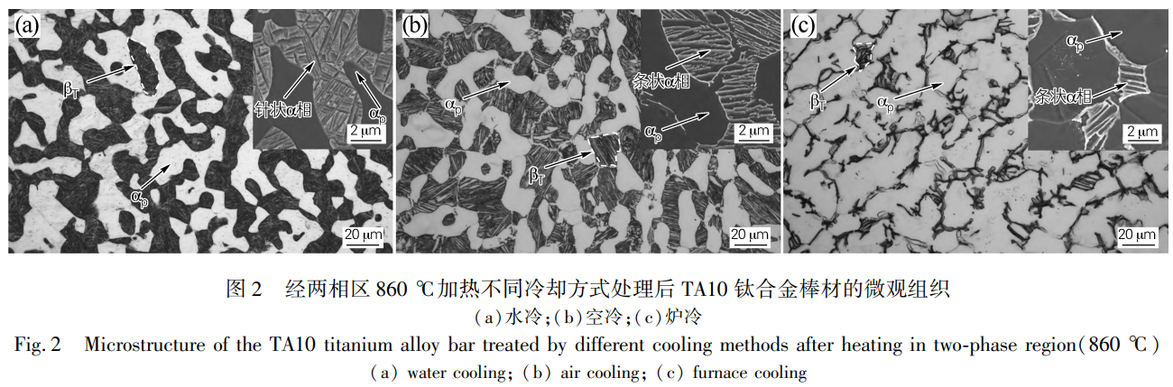 圖2為TA10鈦合金經兩相區溫度860℃加熱后,再以不同冷卻方式處理后的微觀組織形貌。由圖2發現經水冷處理后(見圖2(a)),組織中初生α相(αp)形貌以等軸狀和粗大塊狀為主,并存在一定數量的βT且其內部均勻彌散分布大量細小針狀α相,此時組織類型為雙態組織。經空冷處理后(見圖2(b)),此時組織類型依然為雙態組織,整體形貌與水冷一致,但發現βT中析出的α相形貌由針狀轉變為細小條狀。經爐冷處理后(見圖2(c)),此時的組織類型為等軸組織,相比水冷與空冷,組織中初生α相含量與尺寸有明顯增加,且β轉變組織含量明顯減少。