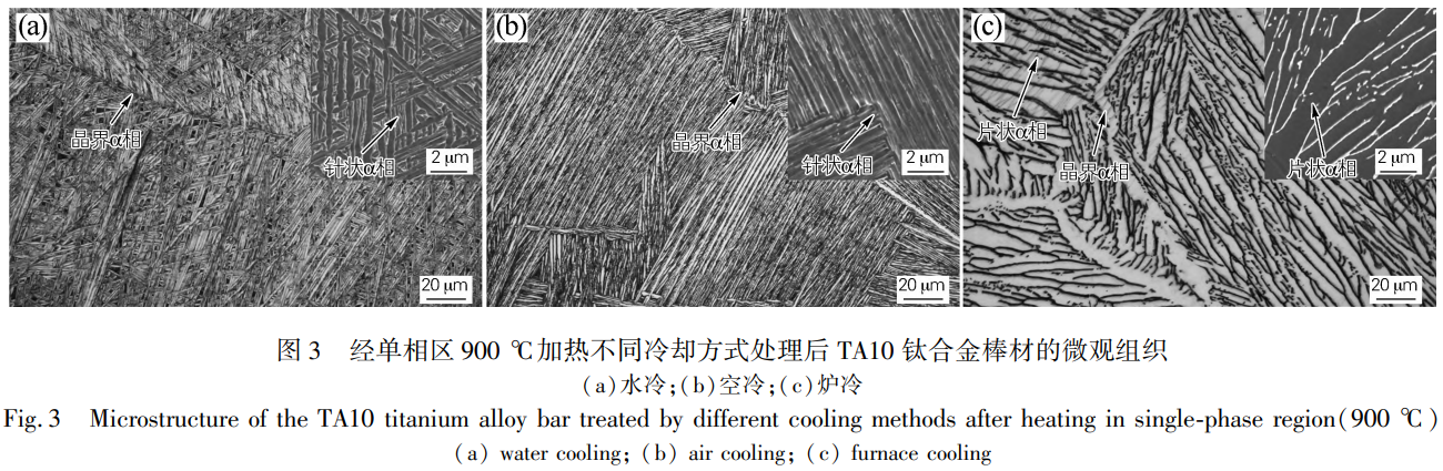1)當加熱溫度為兩相區860℃時,TA10鈦合金經水冷與空冷處理會形成雙態組織,β轉變組織中析出形貌細小的α相,經爐冷處理會形成等軸組織,析出α相尺寸增加。當加熱溫度為單相區900℃時,合金經水冷與空冷處理會形成細片層β轉變組織,且出現粗大β晶粒,經爐冷處理會形成粗片層β轉變組織,晶界α相明顯粗化。