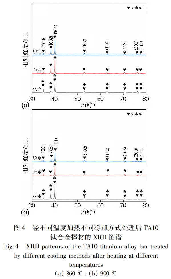 由圖3可知,經不同冷卻方式處理后TA10鈦合金微觀組織產生較為明顯的變化,進而使得組織中物相發生變化,故對其進行XRD測試并分析其物相組成。圖4為TA10鈦合金經不同冷卻方式處理后的XRD圖譜。由于TA10鈦合金為近α型鈦合金,其成分中包含的β類穩定元素含量較少,故經冷卻處理后,組織中會形成α′相或次生α相,由于次生α相與α′相的晶體結構一致,其二者均具有密排六方結構,使得次生α相與α′相的點陣常數十分相近,故在XRD圖譜中,次生α相與α′相的衍射峰重合,難以進行有效區分[11-12]。根據上文所述可知,α′相是以切變的方式形成的,次生α相是以擴散方式形成的,且過冷度是影響發生何種轉變的主要因素。有文獻[13]指出,通常情況下,當加熱溫度達到再結晶溫度以上且進行水冷處理時,組織形成的過冷度才能夠達到發生切變的條件,故可知經水冷處理后組織中形成α′相,而經空冷以及爐冷處理后的組織中并無α′相形成。也有文獻[14]指出,近α與α+β型鈦合金,在水冷條件下析出的α′相形貌為細小針狀,結合圖2與圖3的高倍微觀組織可知,經水冷處理后組織中形成細小針狀的α相。
