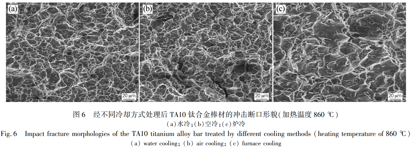 2)在3種不同的冷卻方式中,不同溫度加熱的TA10鈦合金經爐冷處理后的沖擊性能最佳,其次是空冷,水冷最差。經對比發現,在兩相區溫度860℃加熱時,合金經爐冷處理后的沖擊性能最佳,沖擊吸收能量為88J。