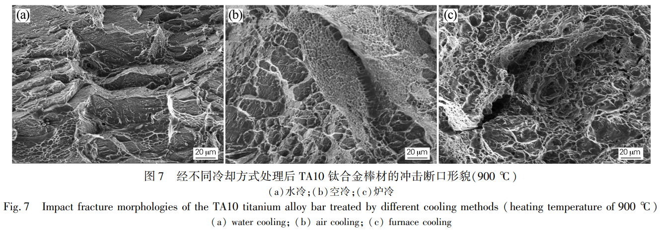 TA10鈦合金經不同溫度區間加熱,再以不同冷卻方式處理后的沖擊斷口形貌如圖6和圖7所示。其中圖6為合金在兩相區溫度860℃加熱時的斷口形貌,此時的斷口形貌主要由韌窩構成,且發現合金經爐冷處理后,其斷口形貌中韌窩尺寸最大。圖7為合金在單相區溫度900℃加熱時的斷口形貌,發現斷口形貌均以巖石狀為主,少量深度較淺且尺寸較小的韌窩在其表面分布。斷口中的韌窩數量與尺寸是判斷合金沖擊性能的主要因素之一,當韌窩數量較多且尺寸較大時,合金的沖擊性能較高,反之當韌窩數量較少且深度較淺時,合金沖擊性能較低。故合金經兩相區溫度860℃處理后的沖擊性能較好,且在3種冷卻方式中,經爐冷處理后的沖擊性能更加優異,與圖5相一致。