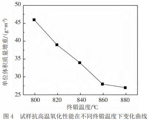 試樣抗高溫氧化性能在不同終鍛溫度下變化曲線如圖4所示,從圖4中可以看出,終鍛溫度最小值為800℃,最大值為880℃,對于新型鈦合金而言,其單位面積質量增重最小值為27g.m-2,最大值為46g.m-2,整體呈現不斷降低的趨勢。該試樣抗高溫氧化性能會隨著單位面積質量增重的不斷上升而呈現上升趨勢。