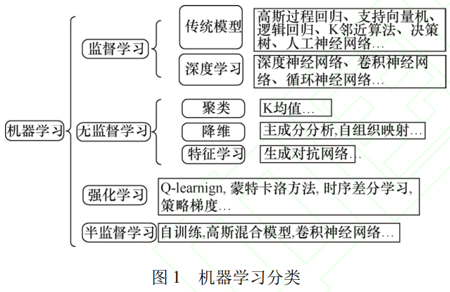 機(jī)器學(xué)習(xí)算法通常分為監(jiān)督學(xué)習(xí)、無(wú)監(jiān)督學(xué)習(xí),強(qiáng)化學(xué)習(xí)和半監(jiān)督學(xué)習(xí) [39]。如圖 1 所示。最廣泛使用的機(jī)器學(xué)習(xí)方法是監(jiān)督學(xué)習(xí)方法 [40]。監(jiān)督學(xué)習(xí)使計(jì)算機(jī)程序能夠從訓(xùn)練集中的一組有標(biāo)記的數(shù)據(jù)中學(xué)習(xí),以便它能夠以盡可能高的準(zhǔn)確性從測(cè)試集中識(shí)別出未有標(biāo)記的數(shù)據(jù) [41]。在這個(gè)過(guò)程中,每個(gè)訓(xùn)練集都有一個(gè)對(duì)應(yīng)于每個(gè)輸入的標(biāo)簽。基于這種關(guān)系,通過(guò)對(duì)已有數(shù)據(jù)集的訓(xùn)練得到最優(yōu)模型。這個(gè)過(guò)程通常使用優(yōu)化算法來(lái)完成,比如梯度下降。當(dāng)模型在指定的數(shù)據(jù)集上完成訓(xùn)練后,便能利用學(xué)到的映射規(guī)則對(duì)新的、未見(jiàn)過(guò)的輸入進(jìn)行預(yù)測(cè)。為了評(píng)估模型的預(yù)測(cè)準(zhǔn)確性,我們會(huì)將其預(yù)測(cè)結(jié)果與測(cè)試數(shù)據(jù)集中的真實(shí)標(biāo)簽進(jìn)行對(duì)比。數(shù)據(jù)集可以有多種形式,包括圖像 [42-44]、音頻剪輯 [45-46] 或文本 [47] 的形式。因此,監(jiān)督學(xué)習(xí)在圖像分類、語(yǔ)音識(shí)別、自然語(yǔ)言處理等多個(gè)領(lǐng)域得到了廣泛應(yīng)用,其中獲取帶有標(biāo)簽的數(shù)據(jù)對(duì)于訓(xùn)練出高精度的模型至關(guān)重要。