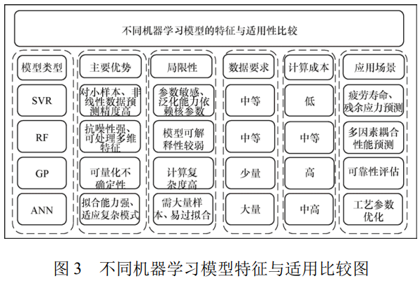 近期文獻(xiàn)表明,將物理知識(shí)融入支持向量回歸模型可顯著提升其泛化能力,尤其在 WANG 等 [87] 的研究中,考慮相關(guān)物理知識(shí)的特征提取過(guò)程使支持向量回歸模型在預(yù)測(cè)疲勞壽命方面展現(xiàn)出更優(yōu)的性能。此外,在王藍(lán)儀 [88] 的研究中,將支持向量回歸與基于物理的模型 (如斷裂力學(xué)模型) 結(jié)合,形成混合模型。這種結(jié)合可以提高預(yù)測(cè)的準(zhǔn)確性,并確保預(yù)測(cè)結(jié)果在物理上的一致性。與傳統(tǒng)應(yīng)用不同,針對(duì) Ti-6Al-4V 增材制造中工藝參數(shù)多樣、特征維度高的問(wèn)題,研究者通過(guò)引入多核 SVR 與基于物理約束的特征篩選方法,提高了小樣本下的疲勞壽命預(yù)測(cè)精度。部分研究將 SVR 與有限元模擬數(shù)據(jù)結(jié)合,建立了工藝參數(shù) - 殘余應(yīng)力的多維映射模型,實(shí)現(xiàn)了物理一致性預(yù)測(cè)。