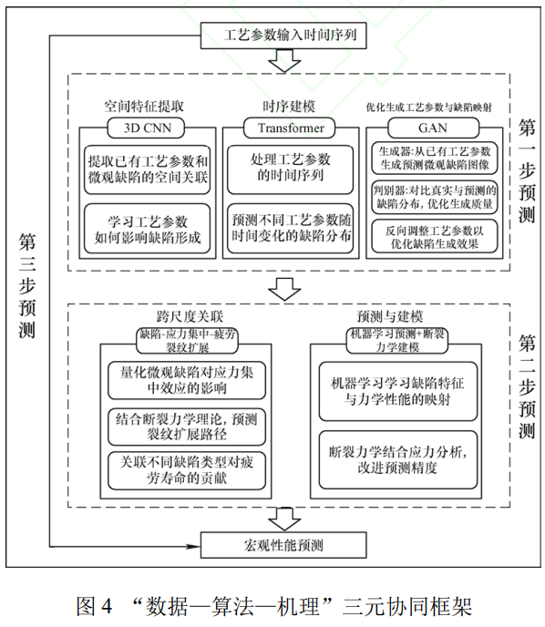 為打通 “工藝參數(shù) - 微觀缺陷 - 宏觀性能” 跨尺度閉環(huán),如圖 4 所示,本文進(jìn)一步構(gòu)建 “數(shù)據(jù) - 算法 - 機(jī)理” 三元協(xié)同框架。該框架在前述基于物理機(jī)理建模與智能算法融合研究的基礎(chǔ)上,整合多源特征提取、對(duì)抗生成與機(jī)理約束學(xué)習(xí),實(shí)現(xiàn)了從工藝參數(shù)到性能響應(yīng)的可解釋映射:3D-CNN 與 Transformer 并行抽取熔池空間特征和工藝時(shí)序演化,GAN 的生成對(duì)抗循環(huán)在高維潛在空間內(nèi)快速鎖定參數(shù)與缺陷間的映射關(guān)系;預(yù)測(cè)缺陷隨即饋入缺陷應(yīng)力集中疲勞裂紋擴(kuò)展模型,以斷裂力學(xué)一次性量化其對(duì)屈服和疲勞壽命的貢獻(xiàn),完成缺陷與性能的反向關(guān)聯(lián)。兩段網(wǎng)絡(luò)端到端級(jí)聯(lián)后,再植入 PINN 可微分物理約束與元學(xué)習(xí)跨任務(wù)先驗(yàn),實(shí)現(xiàn)小樣本場(chǎng)景下的物理可解釋與跨機(jī)遷移能力同步提升,為航空航天級(jí) Ti-6Al-4V 增材制造提供兼顧精度、可信度與工程落地性的統(tǒng)一解決方案。