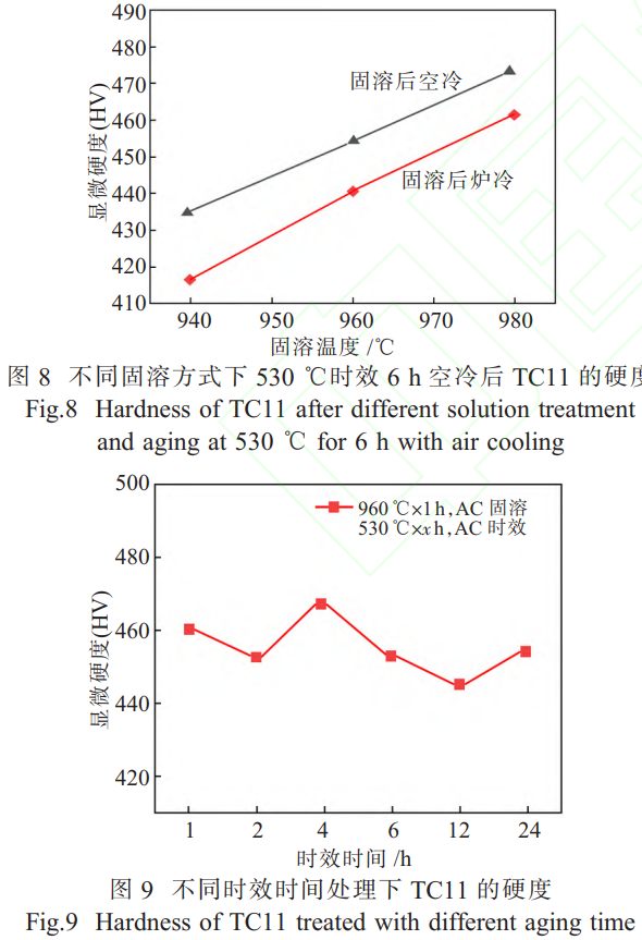 (4)固溶溫度與冷卻方式協(xié)同調(diào)控硬度:980℃×1h 固溶空冷 + 530℃×6h 時(shí)效空冷下,TC11硬度最大,達(dá) 472.43HV,較原始態(tài)(383.76HV)提升 23.1%;相同固溶溫度下空冷的硬度比爐冷的高。