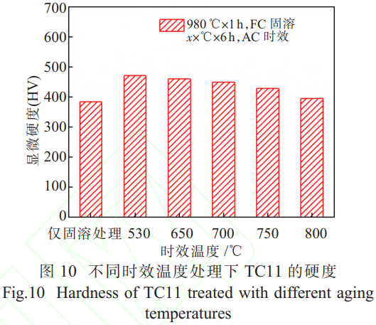圖 10 為不同時(shí)效溫度處理下 TC11的硬度。在 980℃固溶 1h,爐冷 + 不同溫度時(shí)效空冷下,隨時(shí)效溫度在 530~800℃范圍內(nèi)增加,TC11鈦合金的顯微硬度逐漸降低,硬度值從 530℃的 462HV 降至 800℃的 395HV。