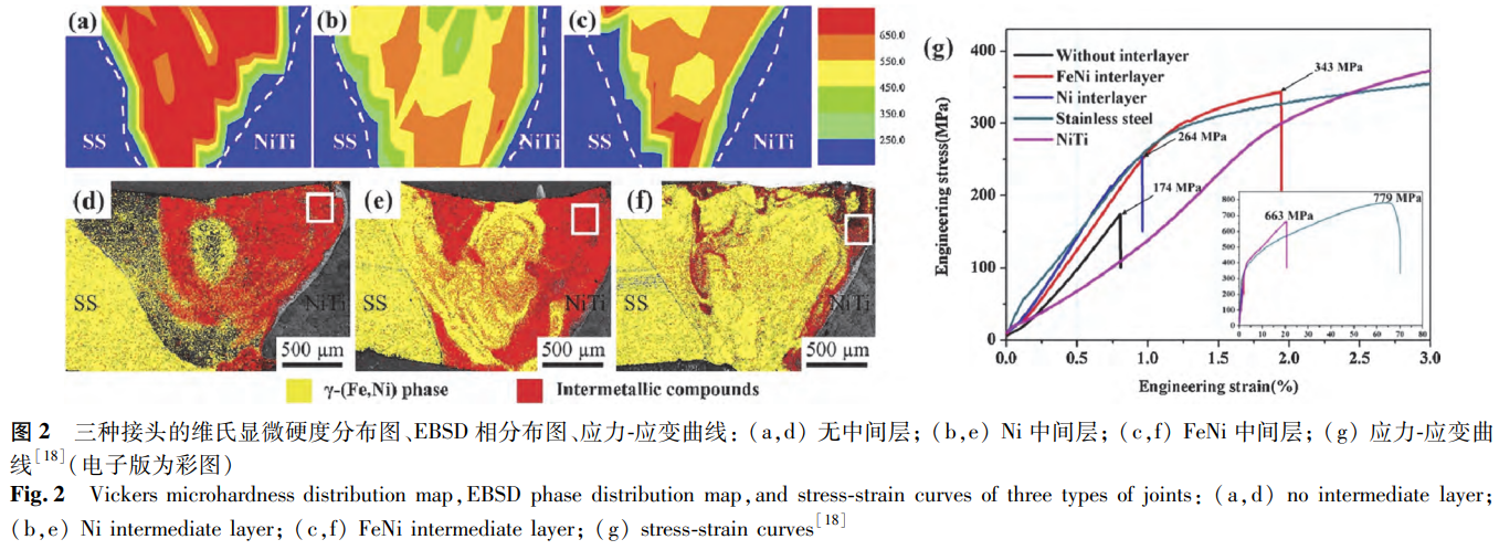 Niu等針對(duì)通過(guò)真空電子束焊接形成的三種NiTi/SS接頭開(kāi)展了對(duì)比評(píng)價(jià),這三種接頭分別為電子束偏移到SS側(cè)且無(wú)中間層的接頭、添加Ni中間層的接頭以及添加FeNi中間層的接頭。各接頭的硬度分布情況如圖2a-c所示,由圖2a-c可知,焊縫區(qū)的硬度顯著高于兩種母材。這一現(xiàn)象的成因在于焊縫區(qū)中存在金屬間化合物以及發(fā)生了固溶強(qiáng)化作用。通過(guò)對(duì)比硬度圖與相分布(見(jiàn)圖2d-f)發(fā)現(xiàn),接頭中的金屬間化合物含量越多,其硬度越高。為進(jìn)一步探究對(duì)其力學(xué)性能的影響,Niu等對(duì)焊接樣品進(jìn)行了拉伸測(cè)試,結(jié)果表明FeNi中間層接頭展現(xiàn)出最優(yōu)的拉伸性能,Ni中間層接頭次之,而無(wú)中間層接頭的拉伸性能最差(見(jiàn)圖2g)。進(jìn)一步觀察發(fā)現(xiàn),三種樣品的斷裂位置均處于焊縫區(qū)內(nèi)靠近鎳鈦合金一側(cè)。借助掃描電子顯微鏡(SEM)和電子背散射衍射(EBSD)技術(shù)對(duì)裂紋分析可知,在無(wú)中間層接頭中,金屬間化合物以Fe2Ti作為主相,Ni3Ti則呈連續(xù)網(wǎng)狀分布于其中。裂紋徑直穿過(guò)金屬間化合物進(jìn)行擴(kuò)展,當(dāng)遇到較厚的Ni3Ti相時(shí),會(huì)出現(xiàn)輕微的偏轉(zhuǎn)現(xiàn)象。由此可見(jiàn),該斷裂接頭呈現(xiàn)出解理斷裂的特征。在Ni中間層接頭里,金屬間化合物以Ni3Ti為主相,F(xiàn)e2Ti呈網(wǎng)狀分布于其中。裂紋的擴(kuò)展僅僅在Fe2Ti相中發(fā)生,并且會(huì)被Ni3Ti相阻擋。因此,該接頭斷口表現(xiàn)出沿晶斷裂的特征。對(duì)于FeNi中間層接頭而言,F(xiàn)e2Ti以柱狀枝晶的形態(tài)析出,Ni3Ti分布在其枝晶之間。裂紋主要出現(xiàn)在Fe2Ti枝晶內(nèi)部,不過(guò)會(huì)被枝晶間的Ni3Ti相阻斷。這種復(fù)合結(jié)構(gòu)能夠有效地阻止裂紋的進(jìn)一步擴(kuò)展,使得斷裂接頭同時(shí)具備解理和韌性斷裂的特征。