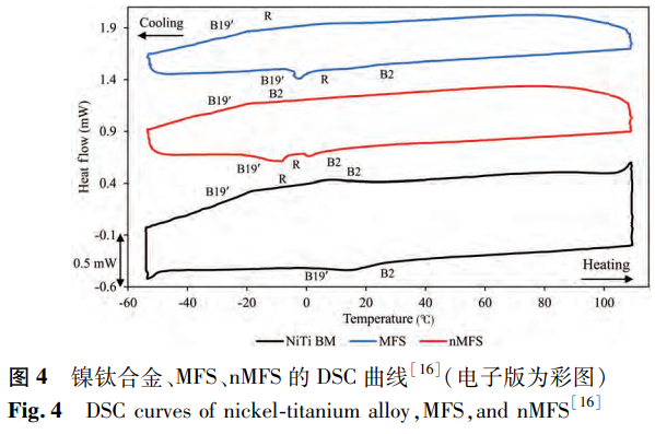鎳鈦合金的形狀記憶效應(yīng)源于馬氏體相變,這是該合金的一項(xiàng)關(guān)鍵性能。激光焊接會(huì)致使合金的顯微組織發(fā)生改變,進(jìn)而對(duì)馬氏體相變以及逆相變過(guò)程產(chǎn)生作用,使得焊接接頭的形狀記憶效應(yīng)有別于鎳鈦合金母材,這一點(diǎn)在已有研究中有所提及。鑒于此,針對(duì)焊接接頭形狀記憶效應(yīng)開(kāi)展研究極為必要,因?yàn)樾螤钣洃浐辖鸬南嘧兲匦允窃u(píng)估其功能特性的重要依據(jù)之一。Farhang等運(yùn)用差示掃描量熱法對(duì)鎳鈦合金以及存在或不存在磁場(chǎng)的NiTi/SS接頭進(jìn)行了測(cè)試,測(cè)試結(jié)果如圖4所示。其中,奧氏體(B2)、馬氏體(B19’)以及R相通過(guò)圖中的峰位得以確定,而奧氏體終止溫度Ai則被用作比較不同樣品之間轉(zhuǎn)變溫度的指標(biāo)。經(jīng)測(cè)試,鎳鈦合金的奧氏體終止溫度為24.7℃,與之相比,nMFS樣品的奧氏體終止溫度降低了約20℃,這表明nMFS樣品的功能特性發(fā)生了明顯改變。導(dǎo)致nMFS樣品轉(zhuǎn)變溫度降低的因素是多方面的,包括其內(nèi)部存在較多的缺陷、焊接過(guò)程中冷加工性能的消除、殘余應(yīng)力和晶粒生長(zhǎng)現(xiàn)象的出現(xiàn)以及Ni/Ti比的上升等。然而,MFS樣品的奧氏體終止溫度為24.1℃,基本保持了鎳鈦合金基材的轉(zhuǎn)變溫度水平,這意味著鎳鈦合金的功能特性在MFS樣品中得到了有效的保留。