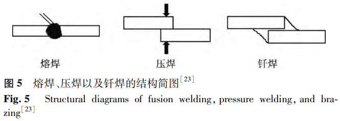 依據(jù)焊接過(guò)程所呈現(xiàn)出的特性,焊接可被劃分為三大類(lèi)別,即熔焊、壓焊與釬焊,其相應(yīng)的結(jié)構(gòu)簡(jiǎn)圖如圖5所示。熔焊是指在無(wú)壓力的情況下對(duì)母材進(jìn)行加熱,使其熔化并相互混合,在冷卻后形成焊縫。氬弧焊、電子束焊、激光焊等均屬于熔焊。壓焊在焊接過(guò)程中必須對(duì)母材施加壓力,但對(duì)加熱沒(méi)有要求。它是一種使材料在固態(tài)下實(shí)現(xiàn)原子間結(jié)合而實(shí)現(xiàn)連接的焊接方法。壓焊可分為多種類(lèi)型,如電阻焊、摩擦焊、超聲波焊等。釬焊是指通過(guò)加熱使焊材之間的填充金屬熔化,液態(tài)釬料與固態(tài)焊材相互擴(kuò)散,冷凝后形成接頭的方法。目前,針對(duì)鎳鈦合金與不銹鋼的焊接研究多聚焦于激光焊接領(lǐng)域。主要得益于激光焊接具備熱輸入量低、能量密度高以及熔合區(qū)與熱影響區(qū)范圍小等顯著優(yōu)勢(shì)。