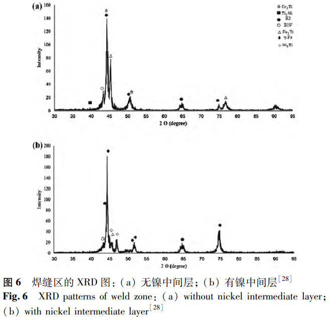 此外,添加中間層也是控制Fe-Ti等金屬間化合物形成的有效方法,能夠改善接頭性能。例如,在直接焊接的TC4/SS接頭中會(huì)產(chǎn)生大量Fe-Ti等金屬間化合物。Liu等采用復(fù)合中間層制備TC4/SS接頭,發(fā)現(xiàn)能夠防止Fe-Ti脆性相的產(chǎn)生,可以在很大程度上優(yōu)化接頭的力學(xué)性能,具有重要的研究?jī)r(jià)值。在鎳鈦合金與不銹鋼異種焊接方面,Asadi等研究了鎳中間層對(duì)激光焊接接頭的影響。通過(guò)x射線衍射(XRD)分析可知(見(jiàn)圖6),添加鎳粉后焊縫的Fe2Ti初生相轉(zhuǎn)變?yōu)镹i3Ti初生相,γ相和Ni3Ti相含量增加,脆性金屬間化合物含量減少。這是因?yàn)楹缚p中過(guò)量的鎳會(huì)造成Ti、Fe和Cr的減少,并且鎳是奧氏體形成元素和γ相穩(wěn)定劑,促進(jìn)了γ-Fe的形成。Li等深入研究了鎳中間層厚度對(duì)焊接接頭產(chǎn)生的影響。研究表明,隨著鎳層厚度逐步遞增,接頭內(nèi)的鎳含量相應(yīng)上升,脆性金屬間化合物減少,進(jìn)而使得接頭性能得以提升。當(dāng)鎳中間層的厚度增長(zhǎng)至50μm時(shí),接頭的抗拉強(qiáng)度以及斷裂伸長(zhǎng)率達(dá)到最大值,分別為372MPa和4.4%。然而,倘若鎳中間層厚度繼續(xù)增加,接頭內(nèi)部會(huì)形成更多的Ni3Ti相,同時(shí)會(huì)產(chǎn)生氣孔與縮孔等缺陷,最終致使接頭性能下降。這一研究結(jié)果與周海寬等等得出的結(jié)論相互吻合、保持一致。因此,為獲得性能優(yōu)異的焊接接頭,需要選擇合適的中間層厚度,即焊縫成分。此后,Li等研究了銅中間層、鈷中間層、38Zn-61Cu中間層對(duì)NiTi/SS接頭的影響,并在38Zn-61Cu中間層的研究中增加激光偏移技術(shù),在接頭處形成三個(gè)區(qū)域,即SS側(cè)熔合區(qū)、未熔化SS以及NiTi/38Zn-61Cu/SS形成的擴(kuò)散焊縫。在這些研究中觀察到類(lèi)似的現(xiàn)象,即通過(guò)抑制脆性金屬間化合物的形成來(lái)改善接頭的力學(xué)性能。同時(shí),銅中間層的使用還可以消除熱應(yīng)力產(chǎn)生的裂紋,但銅中間層過(guò)厚會(huì)形成富銅球,其與周?chē)w的結(jié)合相對(duì)較弱,有利于裂紋形核和擴(kuò)展。