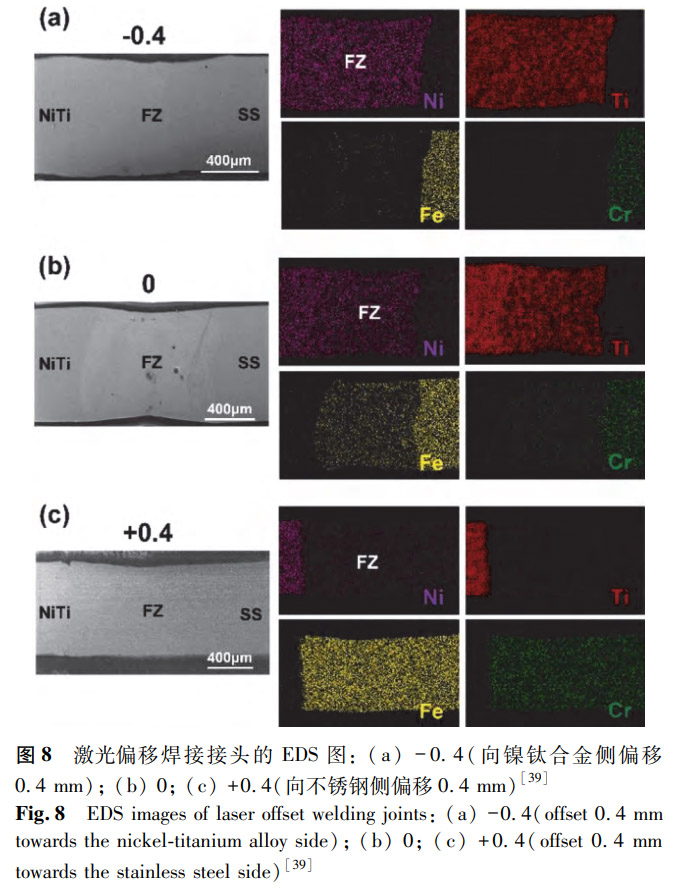 Zhang等對(duì)激光偏移焊接技術(shù)進(jìn)行了研究。激光偏移可以影響元素?cái)U(kuò)散,改變焊縫中的元素含量。如圖8所示,+0.4(向不銹鋼側(cè)偏移0.4mm)接頭的焊縫中主要為Fe和Cr元素,Ni和Ti元素的含量很少。Fe-Ti金屬間化合物被認(rèn)為是削弱NiTi/SS接頭質(zhì)量的主要因素。因此,+0.4(向不銹鋼側(cè)偏移0.4mm)接頭中Ti元素的減少使脆性金屬間化合物減少,從而導(dǎo)致接頭硬度的顯著降低以及拉伸性能的改善。類(lèi)似地,Shamsolhodaei等通過(guò)激光偏移焊接方法對(duì)超彈性鎳鈦合金絲與不銹鋼絲進(jìn)行連接,發(fā)現(xiàn)激光偏移改變了接頭焊接區(qū)的元素分布,提升了接頭性能。