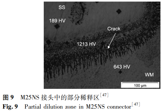 除了選擇合適的焊接工藝參數(shù)外,還可以通過(guò)加入中間層的方法來(lái)改善焊接質(zhì)量。Oliveira等以鎳鈦合金和Inconel625為填充材料,探究了不同填料以及熱處理對(duì)氬弧焊焊接接頭的影響。在接頭中觀察到通過(guò)外延凝固形成的枝晶,枝晶的生長(zhǎng)導(dǎo)致枝晶間空隙中存在溶質(zhì)排斥,并可能形成金屬間化合物,因此,裂紋主要沿著枝晶間區(qū)域形成。無(wú)序晶格減緩了位錯(cuò)的遷移率和原子擴(kuò)散過(guò)程,導(dǎo)致結(jié)構(gòu)中內(nèi)應(yīng)力的形成,提升了其硬度和脆性。相比于鎳鈦合金填料,使用Inconel625填料的接頭通常具有較高的抗拉強(qiáng)度,最佳可達(dá)到286MPa。對(duì)于未經(jīng)焊后熱處理的樣品,在焊縫和母材之間的熔合線處形成了清晰界面區(qū)域,即部分稀釋區(qū)(見(jiàn)圖9),該區(qū)域會(huì)析出金屬間化合物。在進(jìn)行熱處理之后,焊接接頭中不存在部分稀釋區(qū)。且焊后熱處理減小了接頭中的殘余應(yīng)力,使接頭具有更高的力學(xué)性能。