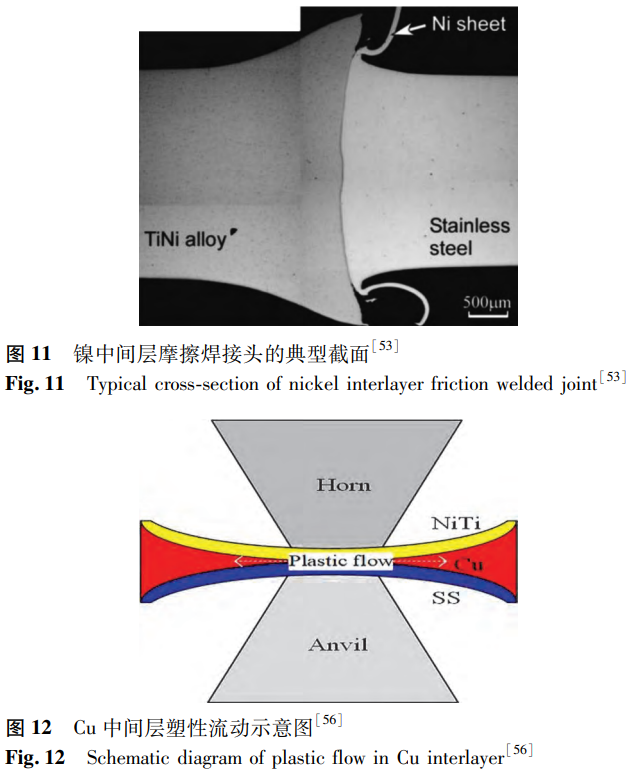 在超聲波焊接過(guò)程中,材料不會(huì)熔化,這抑制了過(guò)渡相的形成,適合異種金屬的焊接。其核心是超聲振動(dòng),高頻超聲振動(dòng)有助于促進(jìn)焊接時(shí)材料的聲軟化。在實(shí)際等效軟化效果的條件下,熱軟化所需的熱能輸入是超聲能量的107倍。Chen等發(fā)現(xiàn)未添加中間層的NiTi/SS超聲波點(diǎn)焊接頭具有機(jī)械互鎖結(jié)構(gòu),抗拉強(qiáng)度可達(dá)到404.71N。Ao等制備了具有Cu中間層的NiTi/SS超聲波點(diǎn)焊接頭,并研究了不同焊接能量輸入對(duì)接頭的影響。研究發(fā)現(xiàn),焊接時(shí)的接觸壓力不均勻?qū)е翪u中間層發(fā)生塑性流動(dòng)(見(jiàn)圖12),使接頭的焊接界面呈現(xiàn)出NiTi/Cu/304SS界面和NiTi/304SS界面兩種類(lèi)型。在不同能量輸入下,異種接頭的兩個(gè)界面處均未發(fā)現(xiàn)金屬間化合物。在性能方面,平均拉伸剪切載荷先增后減,在750J時(shí)達(dá)到690N的最大值。這是因?yàn)殡S著能量輸入的增大,熱輸入增加,材料軟化,銅中間層塑性變形,使得結(jié)合區(qū)擴(kuò)展到整個(gè)界面,接頭性能顯著提升。當(dāng)能量輸入過(guò)大時(shí),由于銅中間層的斷裂,鎳鈦合金與不銹鋼直接接觸,接頭性能降低。Chen等使用Al中間層進(jìn)行了相似的研究,鋁中間層的塑性流動(dòng)也產(chǎn)生了雙界面。不同的是,焊接能量較高時(shí),界面處會(huì)形成Fe4Al13脆性相。當(dāng)焊接能量適中、界面機(jī)械聯(lián)鎖程度高、元素?cái)U(kuò)散距離長(zhǎng)、不存在連續(xù)脆性相時(shí),接頭性能最佳。