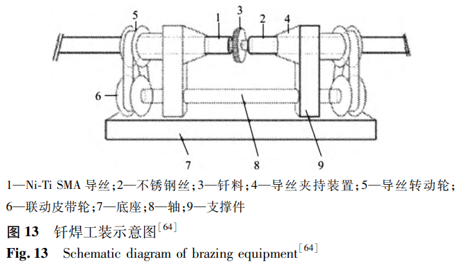 閻開(kāi)婷等公開(kāi)了一種血管內(nèi)鎳鈦合金導(dǎo)絲、導(dǎo)絲焊接工裝及導(dǎo)絲焊接方法。焊接工裝如圖13所示,在氬氣保護(hù)氣氛下,利用夾具連續(xù)轉(zhuǎn)動(dòng)線材進(jìn)行激光小光斑多點(diǎn)環(huán)繞加熱,使釬料熔化包覆在階梯狀端頭上,完成鎳鈦合金與不銹鋼的端部連接。