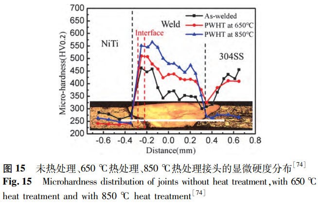 Chen等研究了焊后退火工藝對(duì)以鎳為中間層的NiTi/SS接頭的影響。研究表明,未熱處理接頭的NiTi/Ni界面可分為兩層,隨著焊后熱處理溫度的升高,NiTi/Ni界面和焊縫處析出越來(lái)越多的Ni3Ti金屬間化合物,在850°C接頭的NiTi/Ni界面中已全部轉(zhuǎn)變?yōu)镹i3Ti相。這使得所有接頭的硬度在NiTi/Ni界面達(dá)到最大,且焊接區(qū)硬度隨著退火溫度的升高而提高,如圖15所示。由于焊后熱處理使接頭組織逐漸趨于均勻化,焊縫的最大硬度與平均硬度之間差值減小,接頭的抗拉強(qiáng)度提高,在850℃接頭中達(dá)到643MPa的最大值,是未熱處理接頭抗拉強(qiáng)度的2.12倍。因此,焊后熱處理可以改善焊接接頭的性能,但為了達(dá)到預(yù)期效果,需要選擇合適的熱處理工藝。