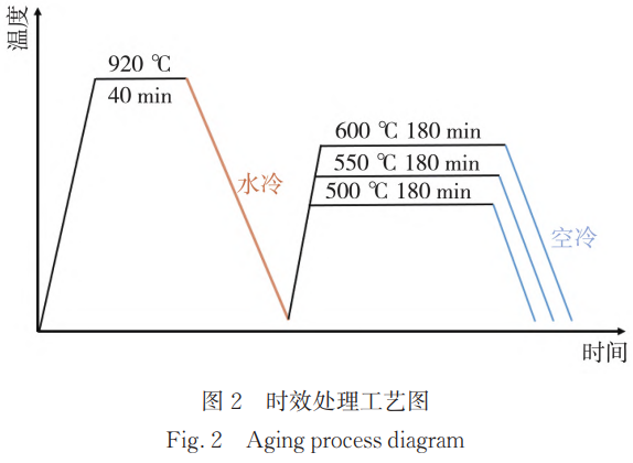 將切割出來的試樣放入管式爐內,并加熱至920℃,隨后保溫40min并水冷卻。然后再將其分別加熱到500℃、550℃和600℃,保溫3h,進行時效處理。時效處理工藝圖如圖2所示。