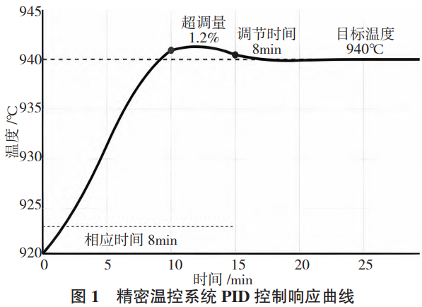 從圖1可知,精密溫控系統(tǒng)在目標(biāo)溫度設(shè)定成940℃時展現(xiàn)出優(yōu)異動態(tài)特性,系統(tǒng)響應(yīng)時間為8min且超調(diào)量僅1.2%,遠(yuǎn)遠(yuǎn)優(yōu)于傳統(tǒng)控制系統(tǒng)15min響應(yīng)時間和5%超調(diào)量的性能指標(biāo),溫度穩(wěn)定之后波動幅度被控制在±1.5℃范圍內(nèi),滿足±2℃的精度要求。