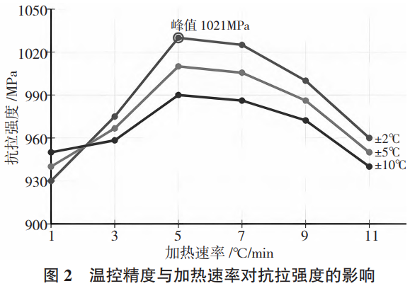 溫控參數(shù)優(yōu)化研究顯示加熱速率與溫控精度存在協(xié)同效應(yīng),當(dāng)加熱速率控制在 3~7C/min時,溫控精度對組織性能影響最為顯著,通過開展系統(tǒng)性的參數(shù)優(yōu)化實驗揭示了溫控技術(shù)的性能提升規(guī)律,如圖 2所示。