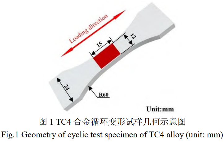 試驗材料為準 β 退火態鍛造處理的 TC4 合金,整體無明顯各向異性。其化學成分(質量分數,%)為:Al 5.5~6.35,V 3.6~4.4,C ≤0.05,N ≤ 0.03,O ≤ 0.13,H ≤ 0.0125,Fe ≤ 0.25,Ti 余量。試樣參考 HB 5287—1996《金屬材料軸向加載疲勞試驗方法》設計,試樣幾何尺寸和加載方向如圖 1 所示,采用線切割進行加工。試樣平行段中間紅色區域為材料微觀表征測試區域,使用 400~2000 號 SiC 砂紙依次打磨,并用粒度為 0.05 μm 的 OPS 懸浮液進行鏡面拋光。最后在 Buller Vibrome-2 型振動拋光儀上振動拋光。所用腐蝕液為 Kroll 試劑(3%HF + 6%HNO3 + 91%H2O,體積分數)。