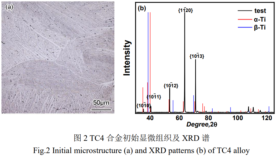 準β退火態 TC4合金初始顯微組織及 XRD譜如圖 2所示。由圖 2a可見,組織由粗大的β晶粒和晶界α組成,β晶粒內部有不同取向集束α,同一集束內α片層近似平行,片層寬度在2μm左右。圖 2 b為α相和β相標準粉末樣品的 XRD譜以及 TC 4合金樣品 XRD譜。可見,合金主要顯示α相的衍射峰,未觀察到β −Ti衍射峰,這是由于合金中β-Ti含量較少所致。此外, XRD譜中{11 20}與{10 13}晶面的衍射峰強度明顯高于標準粉末樣品,表明由于原材料鍛造退火處理后晶粒變得粗大,在 XRD測試過程中表現了一定的擇優取向,具體為晶粒{11 20}晶面法向優先排列在樣品表面法線方向上。