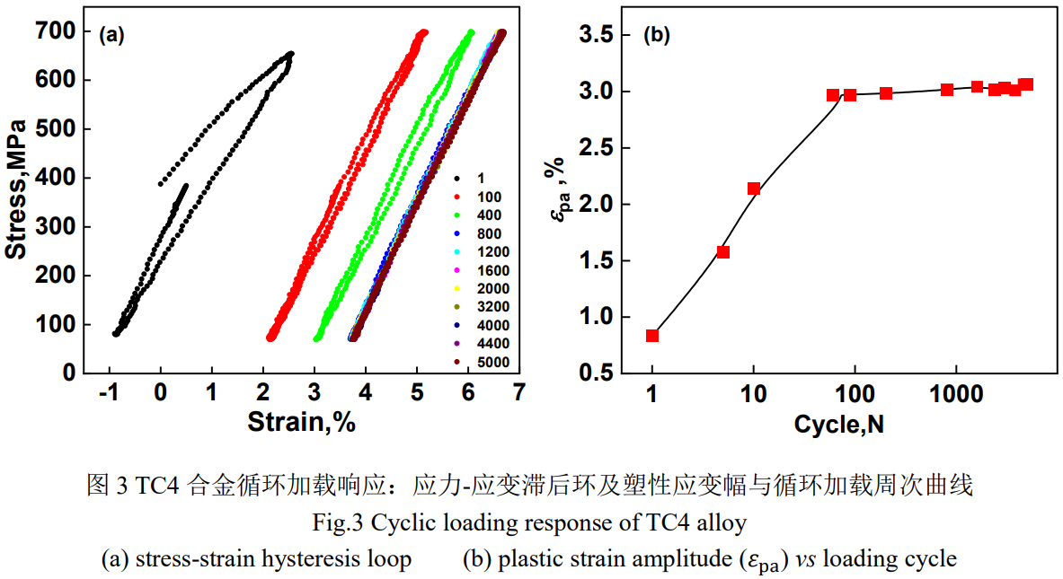 圖 3所示為循環加載 0-5000 cyc范圍內 TC4合金的應力-應變曲線及塑性應變幅(ε pa )與循環加載周次之間的關系。如圖 3a所示,在循環初期,應力-應變滯后環呈現不穩定特征。隨著循環周次增加,滯后環逐漸向拉伸應變方向偏移,同時其寬度逐漸減小并趨于穩定,表明材料的循環變形行為從快速硬化階段進入準穩態階段。在循環至 5000 cyc時塑性應變達到 6.7%,表明材料發生了塑性變形。根據式(1)計算應變幅 (ε pa ):