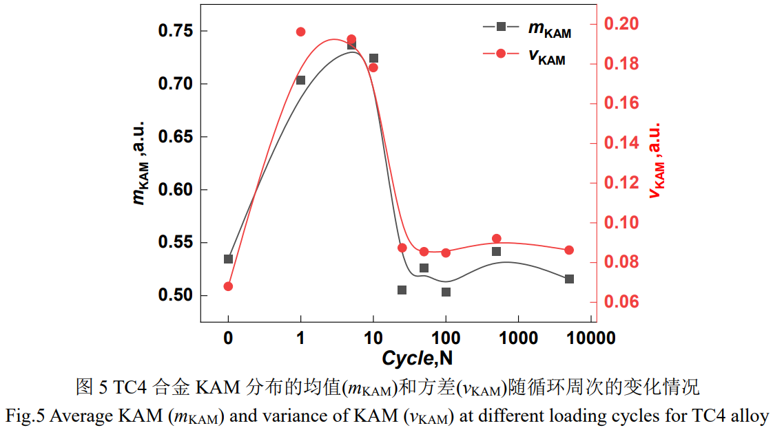 m KAM 可用于推斷循環加載過程中微觀尺度上的塑性應變水平,而v KAM 則能夠量化微觀結構內應變局部化的程度[31]。圖 5為 TC4合金損傷參數m KAM 和v KAM 隨循環周次的變化情況。初始狀態下,兩者均處于較低水平,隨著循環周次的增加,兩者迅速上升:m KAM 從 0.52升至 0.73,v KAM 由 0.068激增至 0.19。循環 10 cyc以后,材料部分區域發生嚴重塑性變形出現零解析區域,導致m KAM 和v KAM 突然降低。此后,兩者趨于穩定,分別圍繞 0.50 0.54與 0.085 0.092低幅振蕩。結合圖 4 i可見,初始狀態下高 KAM區域較少,僅局部團簇或界面顯示輕微的應變集中,因此其損傷參數均處于較低水平。圖 4 j顯示,外載初始作用下部分區域因應力集中導致 Kikuchi衍射花樣質量下降,表明大量可動位錯被激活并晶內局部形成顯著取向梯度,塑性滑移呈現高度局域化,與圖 4b中明顯塑性變形及致密駐留滑移帶直接對應。正是這種極端的局域化變形,導致部分區域(如駐留滑移帶核心)的晶格畸變超過了 EBSD的解析極限,形成了“零解析區域”。如圖 5所示,這些代表最嚴重損傷的區域在統計時被排除,是導致隨后計算得到的m KAM 和v KAM 出現“急劇降低”這一統計現象的直接原因。而當m KAM 和v KAM 穩定時, KAM分布圖(圖 4 k和 l)中高 KAM區域面積減少、分布趨于離散,說明大多數晶粒內部的取向梯度已趨于穩態,僅余少量高 KAM斑塊殘留于晶界或團簇邊緣。損傷參數m KAM 和v KAM 的演變趨勢與材料宏觀力學響應高度一致。