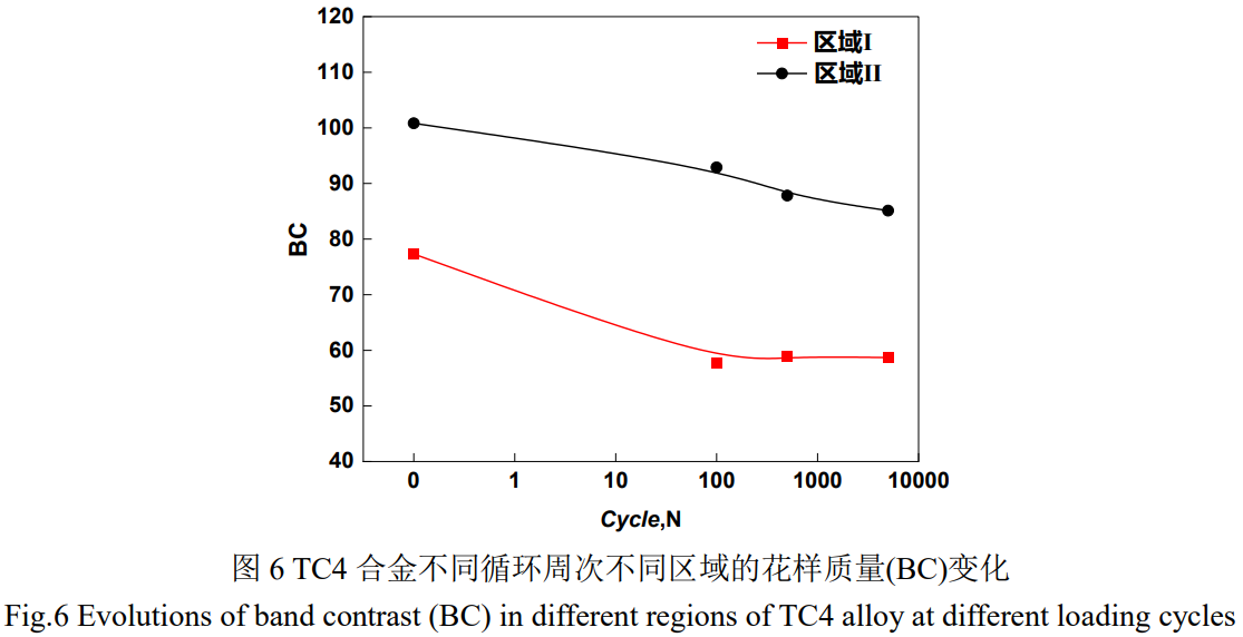 進一步提取不同循環周次、具有典型微織構特征區域I與相同取向區域II的花樣質量(band contrast,BC)變化(圖6)。BC值反映衍射信號質量,其下降直接關聯于位錯等晶體缺陷導致的晶格畸變。分析表明,微織構區域I的BC在前100 cyc從77.32快速降低到57.65,降低幅度為25%,此后周次趨于穩定;區域II的BC從0cyc時的100.83變為5000cyc時的85.12,下降約15%。后者BC值始終高于前者,定量證實了微織構區域在循環加載中經歷了更劇烈的塑性變形,累積了更高的位錯密度與晶格畸變。這一現象取決于微織構區域獨特的微觀結構。如圖4e所示,區域I由多個晶體學取向高度一致的a片層集束構成,形成了一個尺度遠大于單個晶粒的“軟性”單元。在循環載荷下,這種取向一致性使其表現出“類單晶”行為:集束內部晶粒間的變形約束較弱,允許滑移在多個平行片層間協調傳遞,從而使整個微織構區域能夠協調更大的塑性應變。與之相對,區域II中的細小晶粒受四周取向各異的其他晶粒制約,變形受到強烈約束,故塑性發展緩慢。這種“類單晶”行為使得晶粒團簇能夠協調更大的塑性變形,但同時也加劇了其與周圍硬取向區域在界面處變形不協調性,導致顯著局域應力集中。因此,這種具有特定取向的晶粒團簇在循環載荷下更易成為損傷形核的核心位置[21]。Littewood等[32]在TC4合金塑性變形過程中,發現相同取向晶粒團簇承芨蟮乃芐雜Ρ,而相猎憮喜∠蚓ЯT虺械8叩牡雜Ρ,进一步证时I嗽赥C4合金中,微織構區域作為“軟區”優先塑性協調變形的現象。