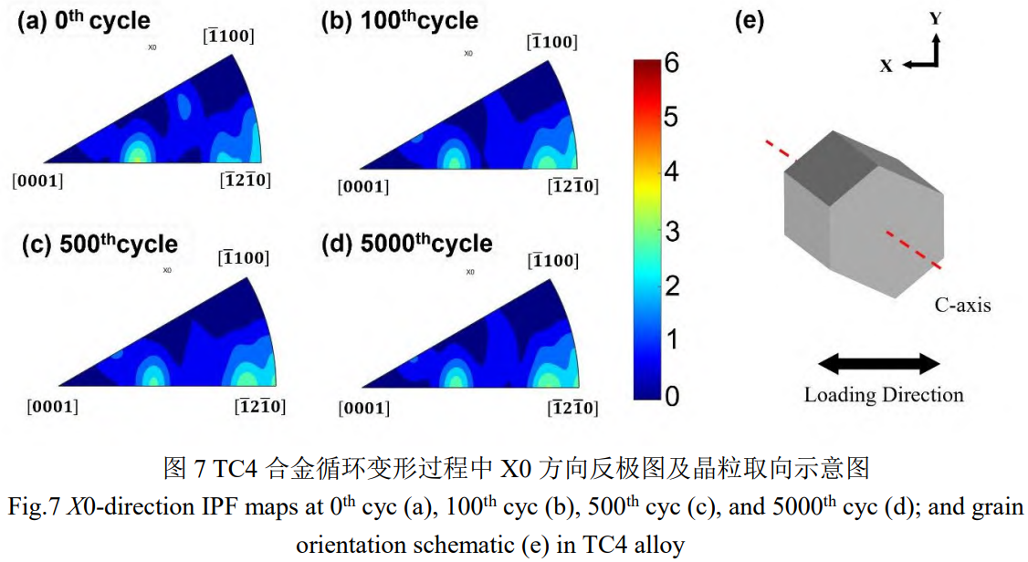(2) 在晶粒 c 軸近似與加載方向垂直的織構條件下,基面{0001}和柱面{101̅0}滑移系被抑制,而錐面{101̅1}滑移由于沿 a 軸和 c 軸滑移的能力有效協調了晶粒的塑性應變,在循環損傷過程中主導材料變形。這種由織構和 Schmid 因子共同主導的滑移機制選擇,是導致微織構區域成為塑性應變集中區和早期損傷形核核心的根本原因。