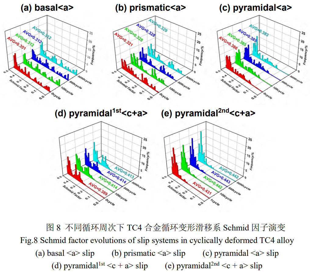 織構的演化直接影響了材料內部各滑移系的Schmid因子分布。圖8為不同循環周次下TC4合金α相各滑移系的Schmid因子演變。統計分析表明,在初始狀態(圖8d)錐面{10}1}