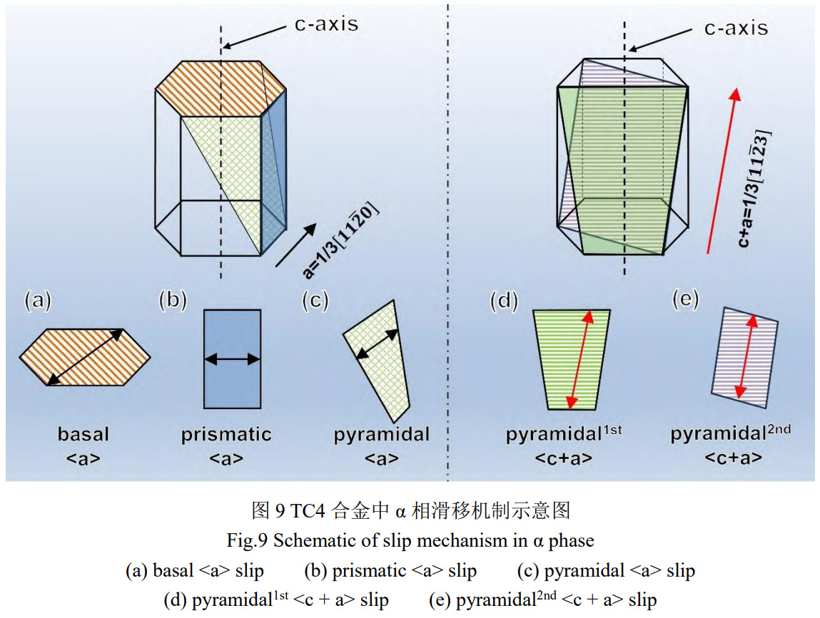 材料的力學性能不僅與材料的微觀組織相關,更與其晶體結構相關[22]。TC4 合金中 α 相為 hcp 結構,滑移主要沿著⟨112̅0⟩和⟨112̅3⟩方向進行;聘菀装l生在具有⟨112̅0⟩方向的型 Burgers 矢量上,這種滑移可以出現在三個柱面{101̅0}晶面以及基面(0002)上[23~25]。⟨112̅3⟩方向的滑移具有 型 Burgers 矢量,因此更難以激活。已有研究[26]表明,低周疲勞條件下 α 相基面/棱柱面滑移主導變形,微裂紋常沿高 Schmid 因子的路徑在初生 α 晶粒內形核。而在加載軸垂直于{112̅0}面的情況下,錐面