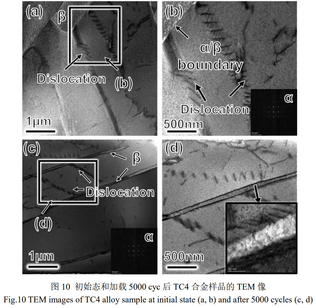 多晶材料的位錯滑移不僅取決于滑移系的激活,更受其微觀結構特征,特別是相界面的顯著影響。圖10為初始態和加載5000 cyc后TC4合金樣品的TEM像。材料初始態(圖10a和b)時,在a相內部殘存有少量的位錯,這些位錯呈現多條平行分布,并且在這些位錯之間還交叉分布著較短的位錯,并向a相內滑移。隨著循環周次增加到5000 cyc,a相內部的微觀形貌并未發生明顯變化(圖10c),但α/β界面對α相內部平行分布的位錯滑移形成阻礙,這種高密度的相界面能夠顯著提高材料循環壽命。由于循環過程中兩相界面處產生切應力,a/β界面處的位錯(圖10d)數量明顯增多,且位錯沿界面呈平行分布,說明在循環變形過程中,界面成為新的位錯源。