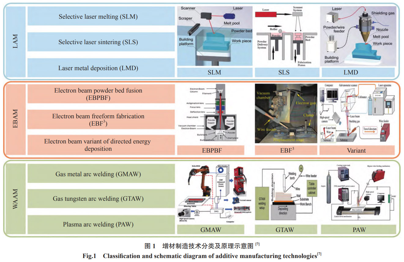 增材制造技術是一種新興的自下而上的制造技術,與傳統的減材/等材制造截然不同,其核心原理主要在于“分層制造,逐層疊加”。在航空航天領域,常見的增材制造技術主要包括激光增材(LAM)、電子束增材(EBAM)和電弧熔絲增材(WAAM)3種類型,如圖1所示[7],其中每種類型又包含不同的專業技術。此外還有學者概括了一些金屬增材制造的新興技術,如材料擠出、粘合劑噴射、粉末床熔融和定向能量沉積等[8]。這些增材制造技術將復雜的三維制造問題分解為簡單的二維層面問題的疊加,從而實現“自由制造”,也在航空航天、醫療、模具等領域展現了一定的應用前景。